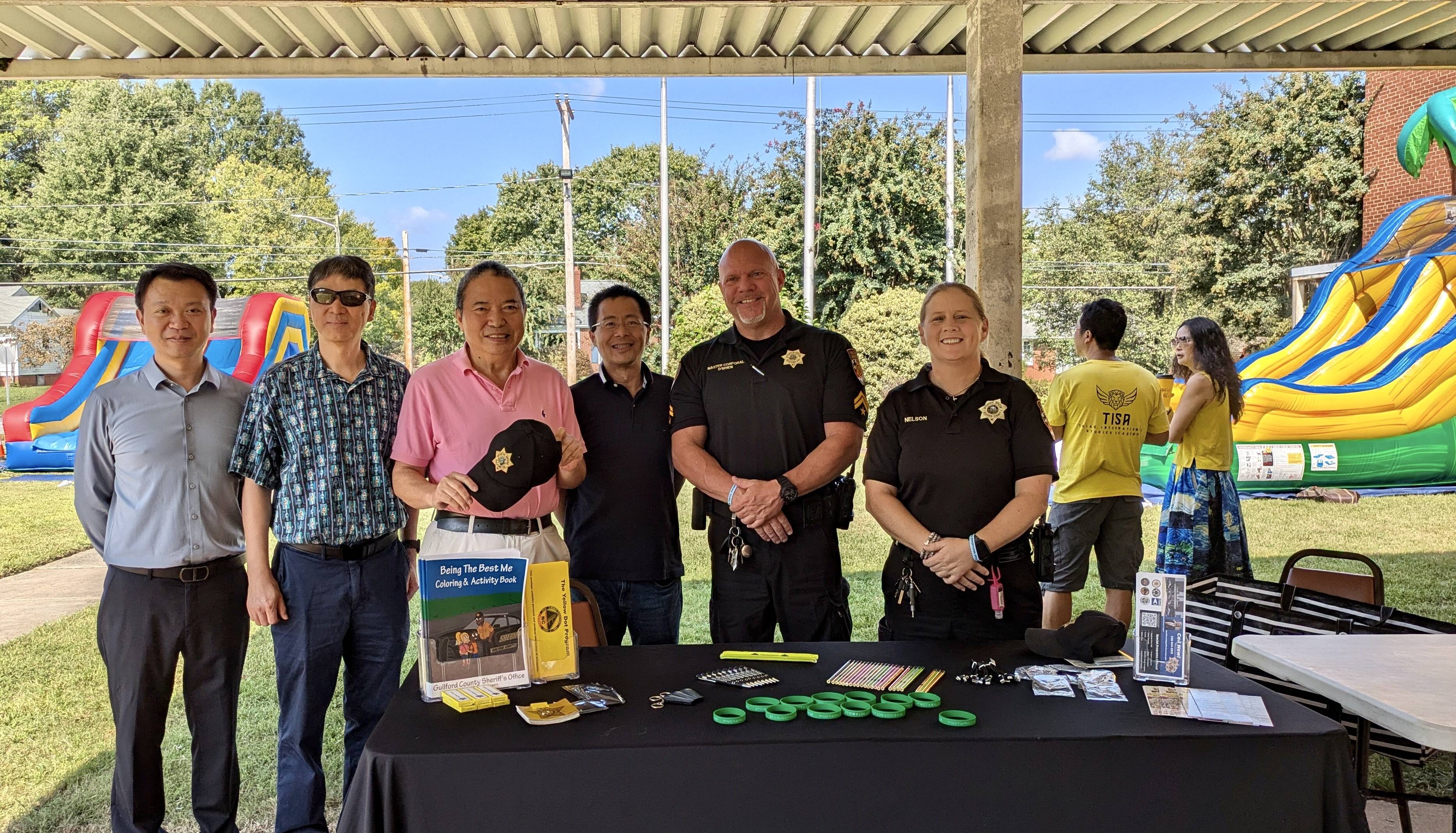 高点市警局警官Patrick OBrien(右2)、警官Tracy P Nelson(右1)和华人朋友在警局摊位前合影