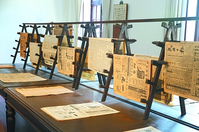 沿着一层的走廊一直走到头,是李大钊曾经工作过的图书馆主任室,百年前的布局清晰可见。展室分为内外两间,靠北的一间是会客室,正中摆有六把木椅和一张木桌,茶盘里还放着老式茶壶和茶杯。窗边的报架上,折叠挂放着泛黄的老报纸。靠南一间是李大钊的办公室,两个书柜里摆放着旧书,办公桌上的笔墨纸砚也复原为刚刚使用过的样子。